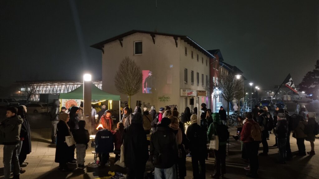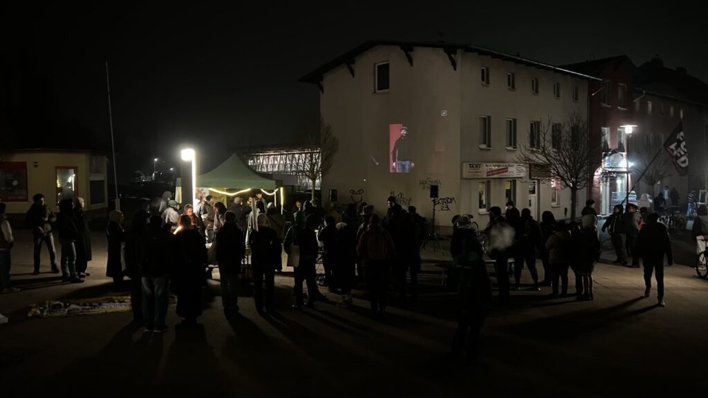 Etwa 80 Menschen beteilgten sich am 04. Dezember 2025 an einer Kundgebung unter dem Motto „Rassismus bekämpfen“. Die Initiative „Barnim solidarisch“ projizierte am Eberswalder Bahnhofsplatz mit einem Beamer kurze Videobeiträge an eine Hauswand. Neben einem Stand mit weihnachtlichem Gebäck und Punsch gab es viel Andrang beim Gutscheintausch. Geflüchtete die nur noch wenig Bargeld bekommen, nutzten die Gelegenheit um Gutscheine gegen Bargeld einzutauschen. Und viele Kundgebungsteilnehmer*innen tauschten die Gutscheine dann gleich wieder in Bargeld um. „Mit unserer Tauschaktion lassen wir die rassistische Bezahlkartenpolitik ins Leere laufen“, so Thomas Janoschka von Barnim solidarisch. „Die Betroffenen können nun wieder selbstbestimmt entscheiden, wo und wofür sie ihr Geld ausgeben wollen und haben nun auch wieder die Möglichkeit ihre Familien in ihren Heimatländern zu unterstützen.“ In Redebeiträgen von „Barnim solidarisch“ und „Women in exil“ wurde ein Ende der Bezahlkarte gefordert.