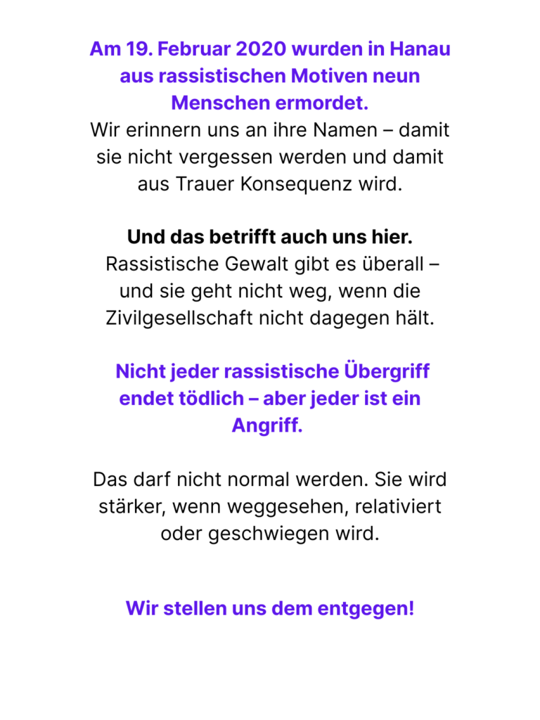 Deshalb rufen wir am Wochenende des Jahrestags des rassistischen Anschlags in Hanau zur Demo auf!